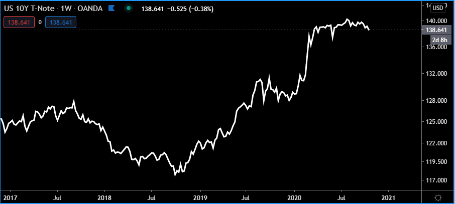 U.S. treasuries are one of the deepest, most liquid markets in the world. In times of uncertainty, money flows to safe, liquid assets like US treasuries. If we just take a look (below) at the 10 year note and 10 year yield we can clearly see how well it is has performed since October of 2018. The bond market had been screaming something was wrong in the economy since October 2018, preceding the March selloff by almost a year and a half. Since March, we can see the 10 year note made new highs and has stayed bid, despite this economic “recovery” we are supposed to be experiencing. Sure, you could argue it’s because the Fed has been purchasing government bonds in the open market via QE. But, the bond market was giving off recession signals well before the Fed decided to started expanding their balance sheet again towards the end of 2019. Also, since about July 1st of this year, the Fed has been almost non-existent in their purchases of US treasuries, yet capital continues to flow into the safe, liquid asset. If history is any indication of the accuracy of the bond market in predicting where the economy is heading, then we are in for a rocky road ahead.