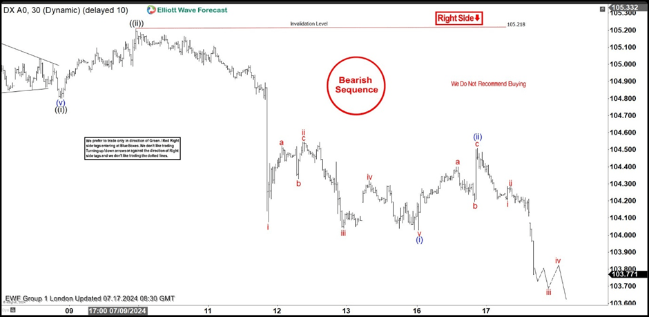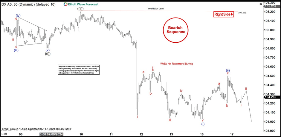 DXY ended cycle from the 105.217 peak as 5 waves structure leading diagonal. Current view suggests we are getting wave (ii) blue recovery , that can be unfolding as 3 waves bounce. We expect Dollar index to keep finding intraday sellers in 3, 7, and 11 swings.