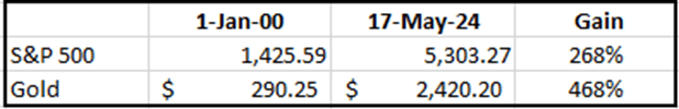 Let’s talk about gold vs. stocks. While the 30 stocks within the Dow Jones Industrial average hit an all-time high of 40k this week, the broader average of the Russell 2000 is down 15% from its high hit in late 2021. The market remains bifurcated just as the trenchant wealth gap of consumers continues to widen. A middle class that has been hollowed out by inflation leads to an unhealthy market, which is best illustrated by looking at the returns of gold vs. the S&P 500.
