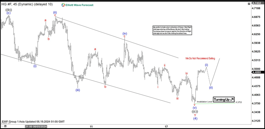 Short term Elliott Wave in Copper (HG) suggests the metal has ended wave (4) correction at 4.375. Wave (3) rally ended at 5.2 on 5.20.2024 which is all-time high price for Copper. Wave (4) pullback unfolded as a double three Elliott Wave structure. Down from wave (3), wave W ended at 4.7435 and wave X ended at 4.903. Wave Y lower subdivided into a zigzag structure where wave ((a)) ended at 4.571 and wave ((b)) ended at 4.696. The 45 minutes chart below shows wave ((b) on the left side of the chart.