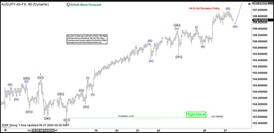 Short term Elliott Wave in AUD/JPY suggests rally from 6.4.2024 low is in progress as a 5 waves impulse structure. Up from 6.4.2024 low, wave 1 ended at 104.8 and pullback in wave 2 ended at 103.57. Internal subdivision of wave 2 unfolded as a zigzag where wave ((a)) ended at 103.6, wave ((b)) ended at 104.27, and wave ((c)) lower ended at 103.56. This completed wave 2 in higher degree and the pair has turned higher in wave 3. Up from wave 2, wave ((i)) ended at 104.38 and pullback in wave ((ii)) ended at 104.