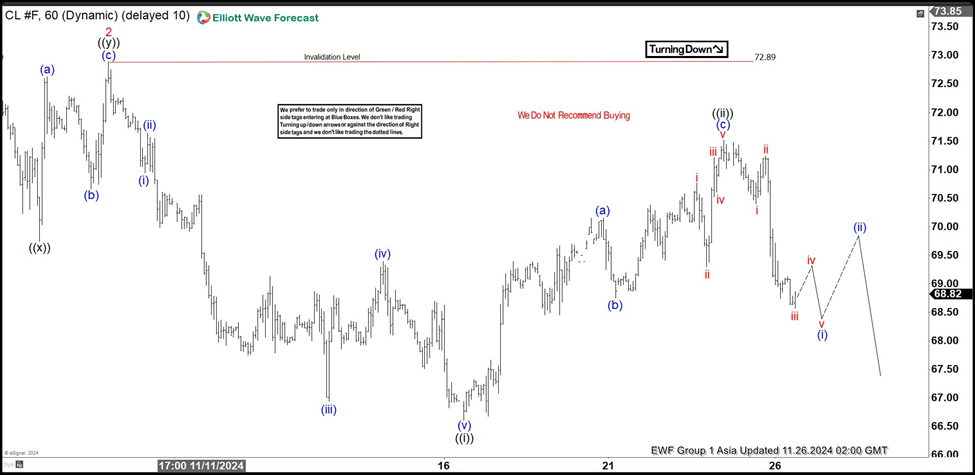 Short Term Elliott Wave View in Oil (CL) suggests that cycle from 10.8.2024 high is in progress as a 5 waves impulse. Down from 10.8.2024 high, wave 1 ended at 66.72. Wave 2 rally ended at 72.89 as the 1 hour chart below shows. It has then turned lower again in wave 3. Down from wave 2, wave (i) ended at 70.94 and wave (ii) bounce ended at 71.64. Wave (iii) lower ended at 66.94 and wave (iv) rally ended at 69.39. Final wave (v) lower ended at 66.61 which completed wave ((i)). Oil then rallied in wave ((ii)) with internal subdivision of a zigzag.