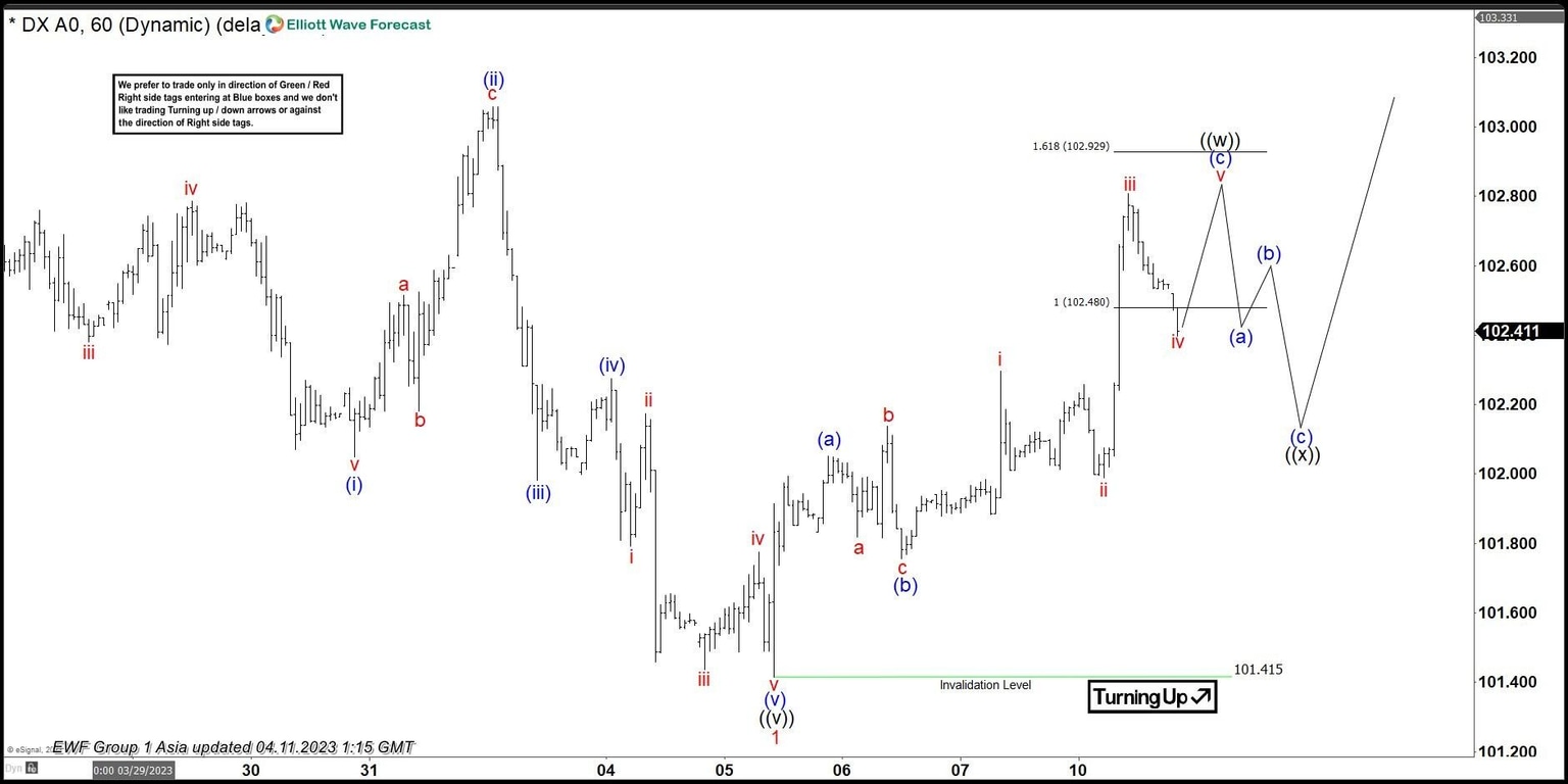 DXY (US Dollar) is showing 5 swings impulse Elliott wave sequence lower from the 3/08/2023 high, which ended at $101.415 low on 4/05/2023. Above there, it favors a corrective bounce in 3, 7 or 11 swings before downside resumes. DXY proposed ended (B) at $105.883 high on 3/08/2023. Below there, it placed ((i)) at $103.484 low & ((ii)) at $105.103 high. ((ii)) was 0.618 Fibonacci retracement of first leg. It placed ((iii)) at $101.915 low on 3/23/2023. It bounced off in ((iv)), which ended at $103.357 high on 3/24/2023. Finally, it ended ((v)) as diagonal sequence at $101.415 low on 4/05/2023 to finish wave 1. Above there, it favors a corrective bounce in wave 2, which should fail below (B) high to resume lower as the part of (C) leg, which confirms below February low.