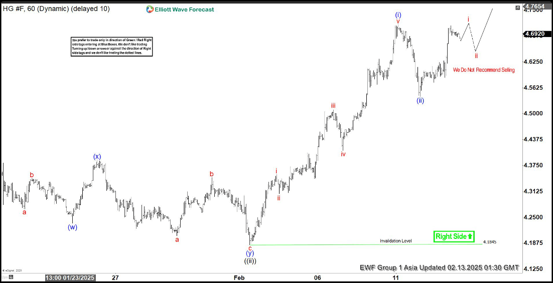 Short term Elliott Wave in Copper shows 5 swing sequence from 11.14.2024 low, favoring more upside. Up from 11.14.2024 low, wave 1 ended at 4.335 and pullback in wave 2 ended at 4.005. The metal has resumed higher in wave 3. Up from wave 2, wave ((i)) ended at 4.47 and pullback in wave ((ii)) ended at 4.1835. Internal subdivision of wave ((ii)) unfolded as a double three Elliott Wave structure. Down from wave ((i)), wave (w) ended at 4.235, wave (x) ended at 4.389, and wave (y) lower ended at 4.184 which completed wave ((ii)) in higher degree.