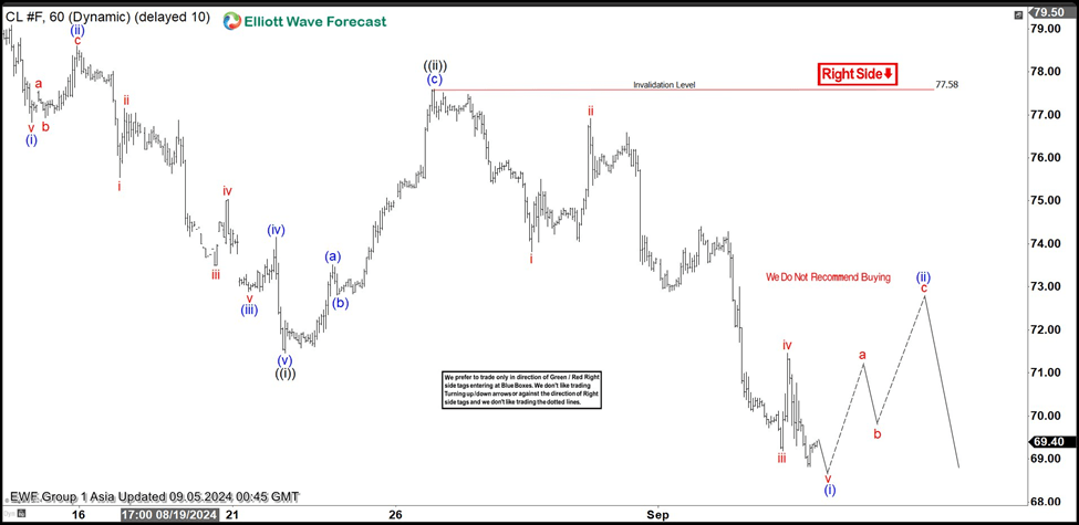 Short Term Elliott Wave in Oil (CL) suggests the decline from 8.13.2024 high is unfolding as a 5 waves impulse. Down from 8.13.2024 high, wave (i) ended at 76.83 and rally in wave (ii) ended at 78.6. The commodity extended lower in wave (iii) towards 72.89 and rally in wave (iv) ended at 74.16. Final leg wave (v) ended at 71.46 which completed wave ((i)) in higher degree. Oil then turned higher in wave ((ii)) with internal subdivision as a zigzag Elliott Wave structure. Up from wave ((i)), wave (a) ended at 73.52 and wave (b) ended at 72.81. Wave (c) higher ended at 77.58 which completed wave ((ii)) in higher degree.