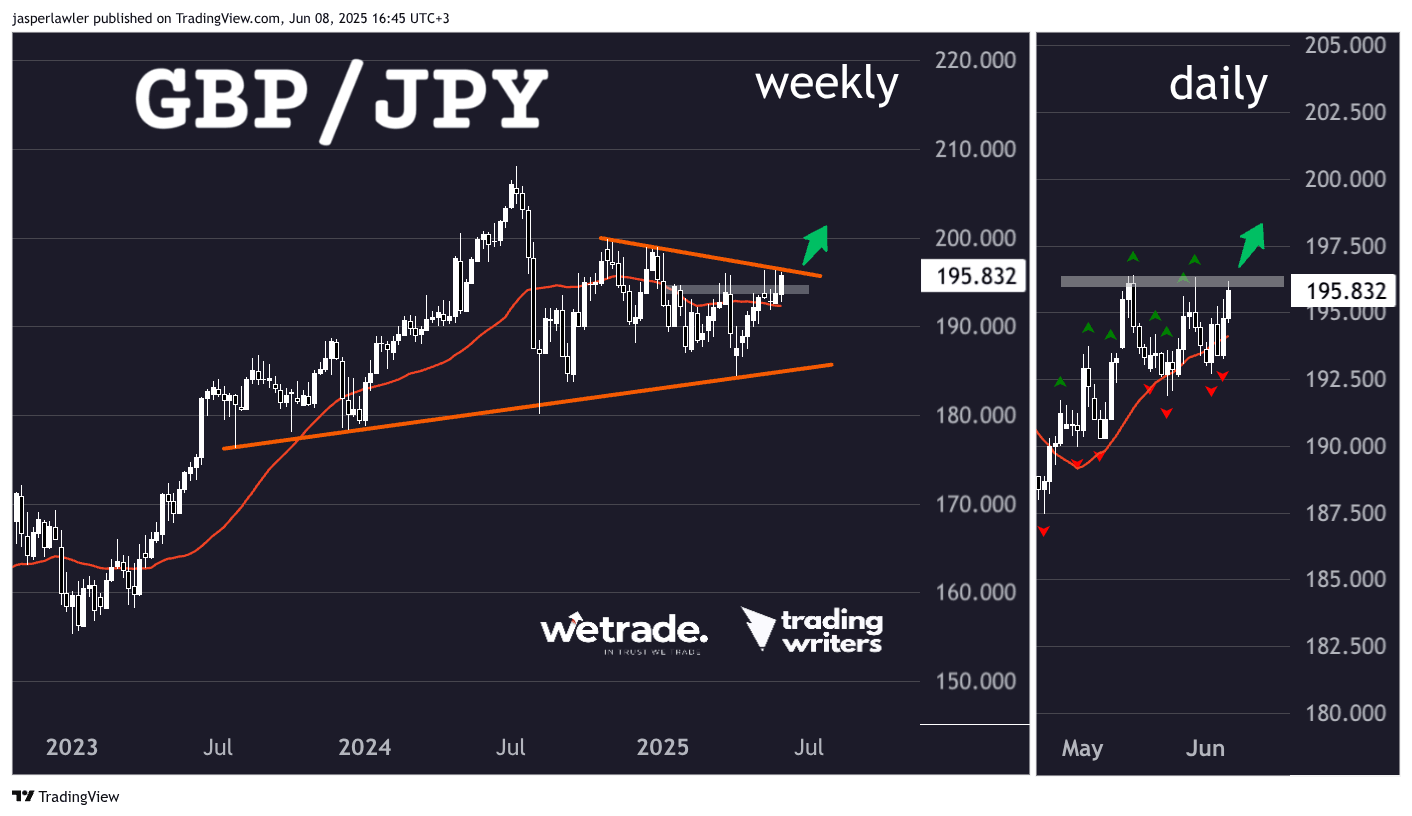 GBP/JPY is pushing up against a downtrend line formed over the 9 months or so. Although the trendline has not yet broken, the highest weekly close since January (above 195 resistance) is bullish and potentially preempts a breakout.