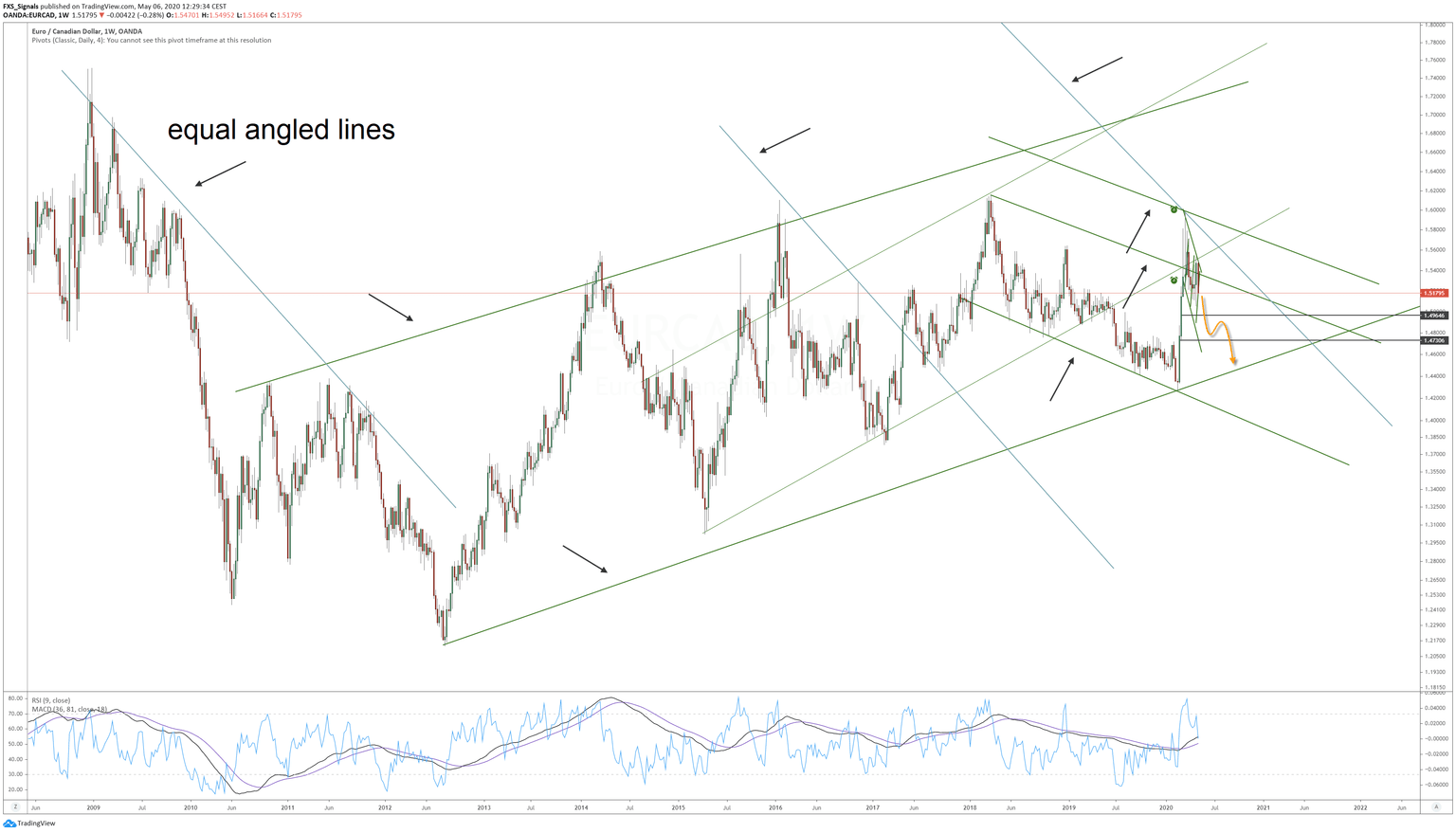 The EUR/CAD does not react to all risk-on/off scenarios equally: it may explore new highs on the upper part of the aforementioned multi-month channel, or it may erode to deeper levels, breaking its lower boundaries. There will be pullbacks along the way with days (or hours) of "risk-on", but another sell-off wave in equities -as we expect for the 2nd half of May- would weigh on the CAD (lifting EURCAD). This means that we have one more week to reach our dowsinde projection before a cycle-induced reversal takes the pair possibly higher.