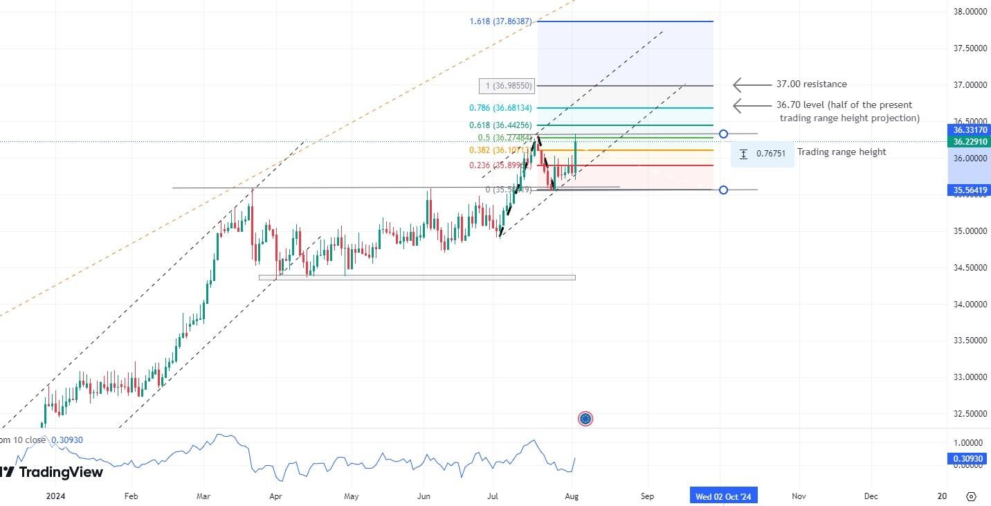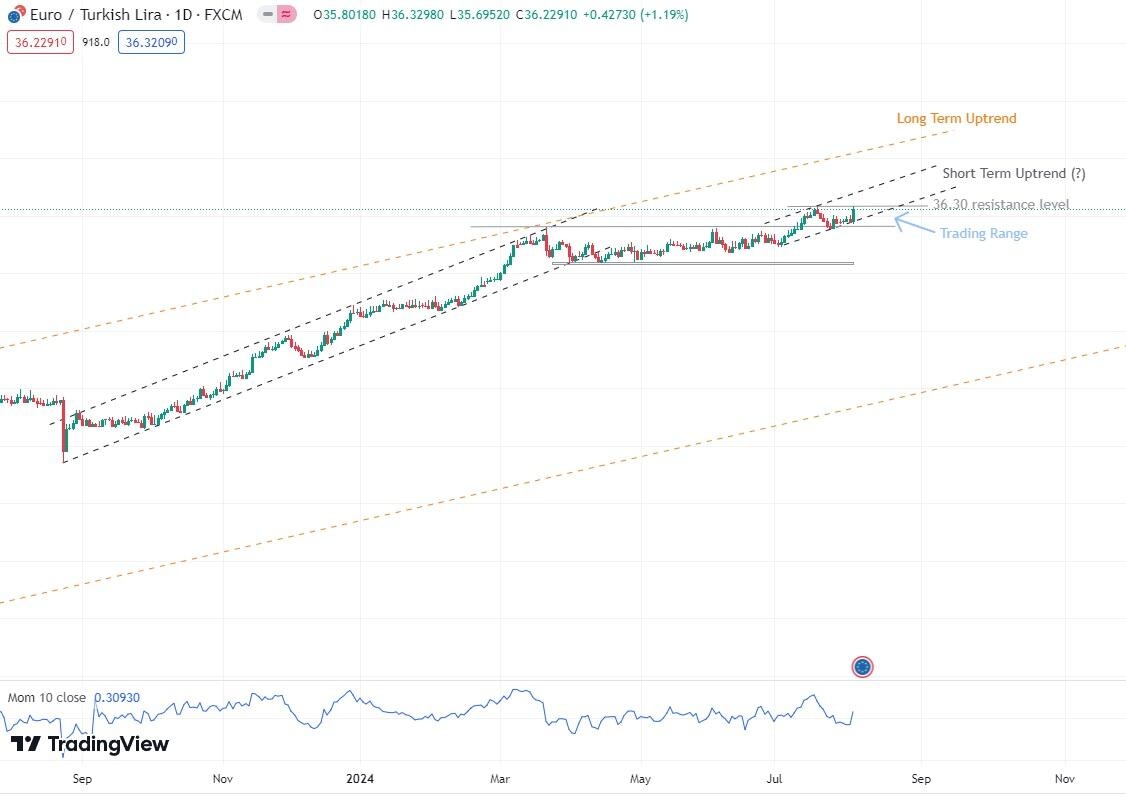 On the technical side, price action seems to reflect this stance. After nearly four months of consolidation, the EUR/TRY pair finally broke out of the 35.60 level at the beginning of July and reached a new all-time high on the 18th, around 36.30 (depending on broker platforms). Since then, EUR/TRY has been moving sideways. However, last Friday was noteworthy: poor economic indicators in the US jolted the markets, prompting a selloff in stocks and a strong appreciation of the EUR/USD exchange rate (more than 1% in a day). The EUR gained strength against the TRY as well, surging strongly and briefly surpassing the 36.30 level before retracing slightly below the resistance. The pair seems to be waiting for a catalyst to get the final push higher, following what appears to be a new short-term upward trend that started on July 3rd.