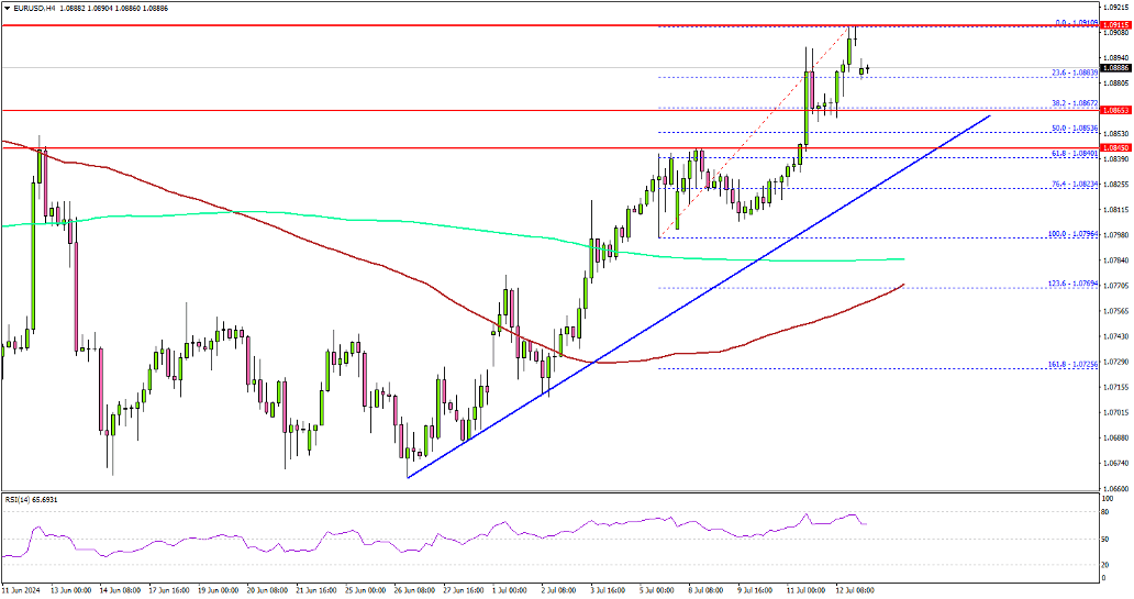 It is now consolidating gains near the 1.0880 zone. If there is a fresh increase, the pair could face resistance near the 1.0910 level. The next resistance sits at 1.0920.