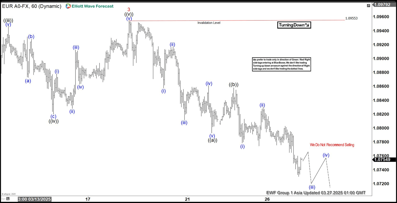 Short term Elliott Wave view in EUR/USD suggests rally from 2.3.2025 low is in progress as a 5 waves impulse. Up from there, wave 1 ended at 1.0528 and pullback in wave 2 ended at 1.036. Wave 3 higher ended at 1.0955 as the 1 hour chart below shows. Pullback in wave 4 is now in progress with internal subdivision as a zigzag Elliott Wave structure.