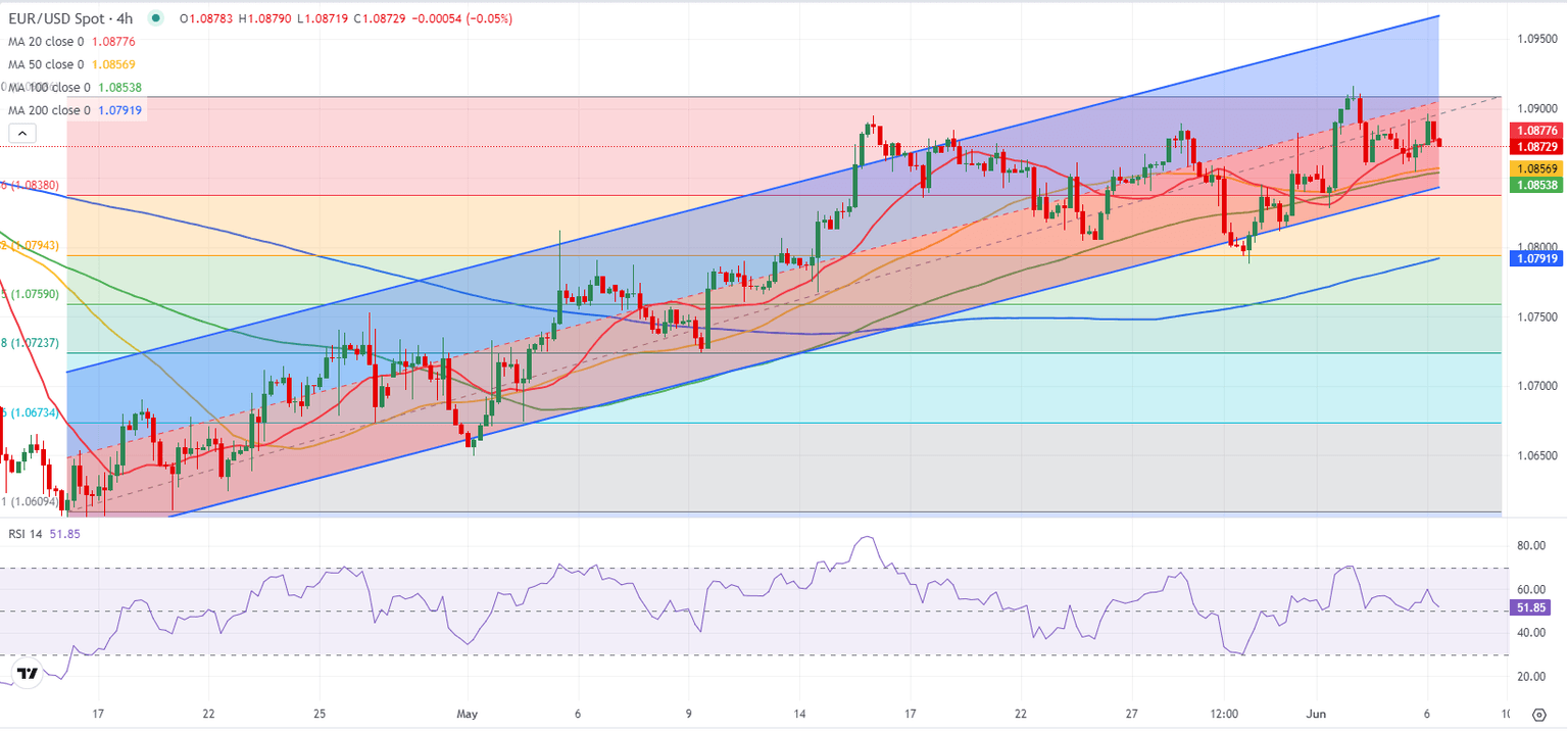 EUR/USD registered small losses on Wednesday but managed to hold comfortably above 1.0850. The pair fluctuates in a narrow channel below 1.0900 as investors await the European Central Bank's (ECB) monetary policy announcements.