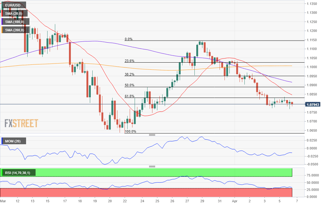 In the case of EUR/USD, the pair spent the day hovering around the 1.0800 threshold, as the shared currency got undermined by the EU Sentix Investor Confidence index plummeted to -42.9 in April, down from -17.1 in March and worse than the -30.3 expected. This Tuesday, the macroeconomic calendar will remain quite light, as Germany will release February Industrial Production, while the US will only publish minor reports that have no chances of affecting the price.