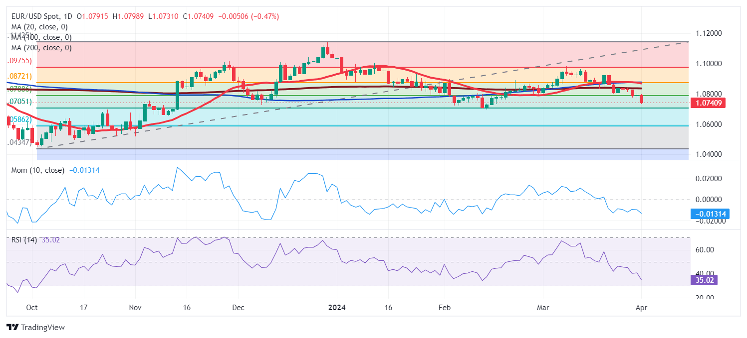 The EUR/USD pair fell on Monday to 1.0730, its lowest since mid-February. The US Dollar surged after Wall Street’s opening, as stocks dipped while solid United States (US) data reflected the strength of the local economy. Last Friday, Federal Reserve (Fed) Chairman Jerome Powell repeated that the central bank is in no rush to trim interest rates as inflation remains high while the economy is resilient.