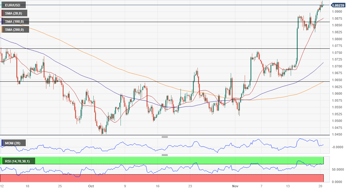 The EUR/USD pair traded as high as 1.0939 on Monday as market participants cheered the end of monetary tightening. United States (US) inflation and employment-related data published in the past few weeks indicated that price pressures continued receding in October while the labor market loosened. The US Dollar edged lower against all its major rivals throughout the Asian session as stock markets advanced.