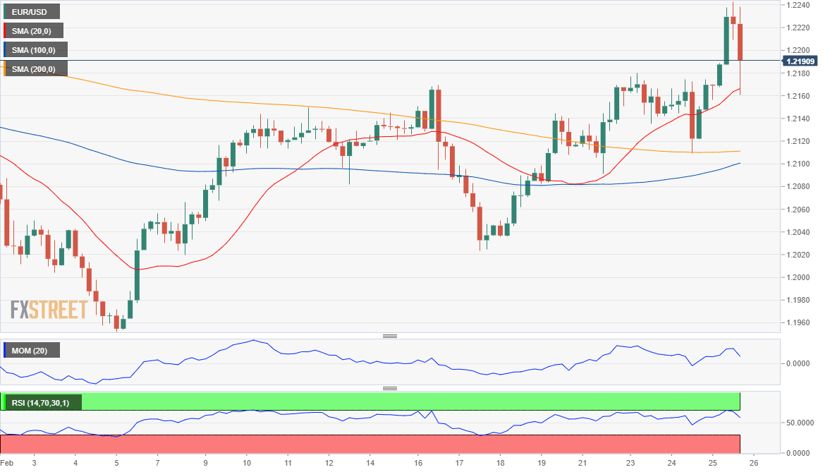 The EUR/USD pair peaked at 1.2242, its highest since early January, finally breaching the 1.2170/80 resistance area. The pair rallied on the back of risk-appetite which dominated financial markets throughout the first half of the day but faded after US investors reached their desks. European indexes closed mixed, while US ones edged lower, erasing pre-opening gains. Meanwhile, US Treasury yields extended their rallies to fresh one-year highs, boosted by encouraging US data.
