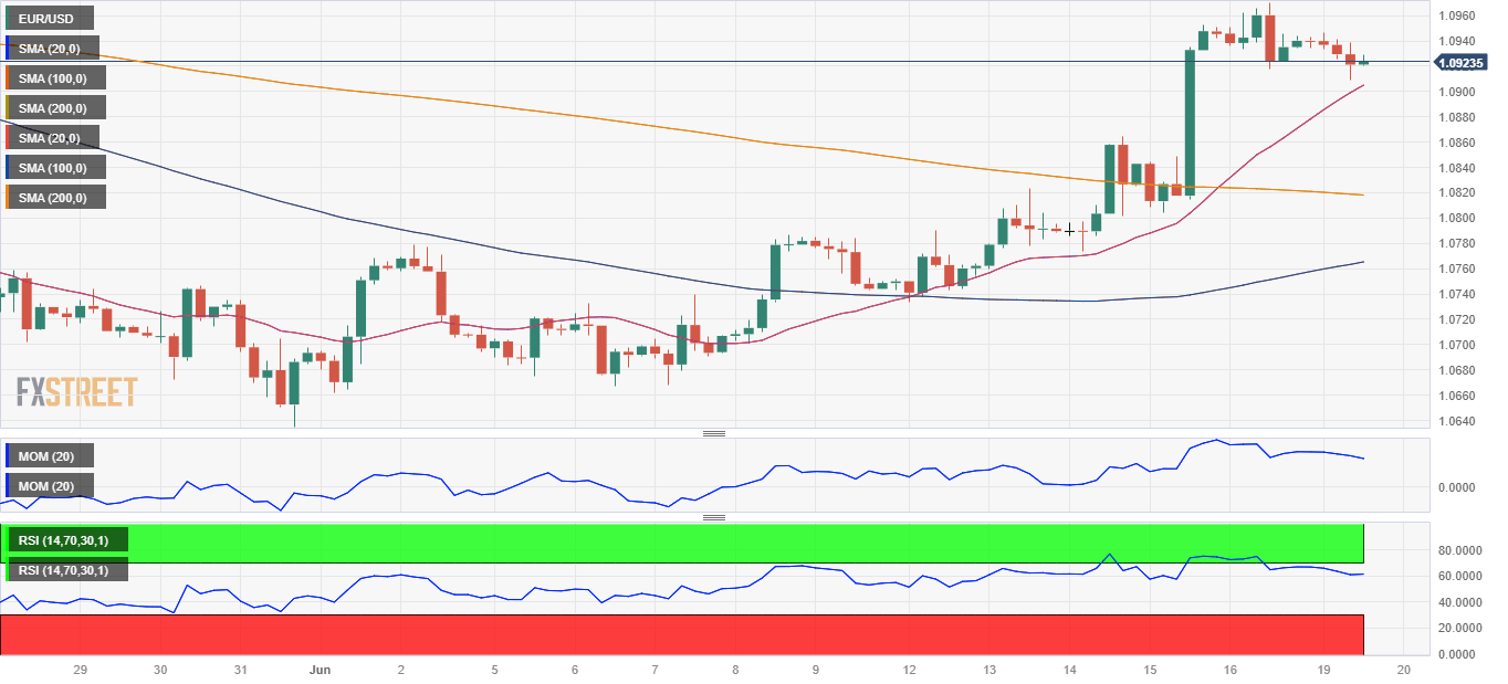 The EUR/USD pair is under mild selling pressure on Monday, easing from the 1.0970 multi-week high posted on Friday, to trade near the 1.0900 level. The US Dollar entered a sell-off spiral following softer-than-anticipated United States (US) inflation-related figures and the Federal Reserve's (Fed) hawkish pause. Financial markets turned optimistic amid speculation the US will avoid a recession. Stocks rallied, while the safe-haven Greenback came out of investors' radar.