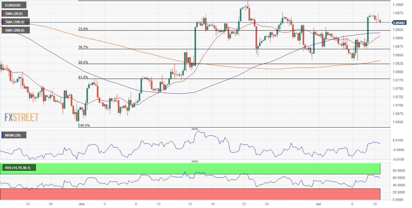 The EUR/USD pair consolidates last week's gains, trading at around 1.0950 after peaking at 1.0972 on Friday. The US Dollar gains uneven traction across the FX board as investors turned cautious ahead of first-tier events later this week. The main focus is the United States (US) Consumer Price Index (CPI). Inflation is expected to have eased to 3.1% YoY in June from 4% in May. The monthly increase, however, is foreseen up by 0.3%, following 0.1% in the previous month. Finally, the core annual reading is forecast at 5%, also decreasing compared with the previous month.