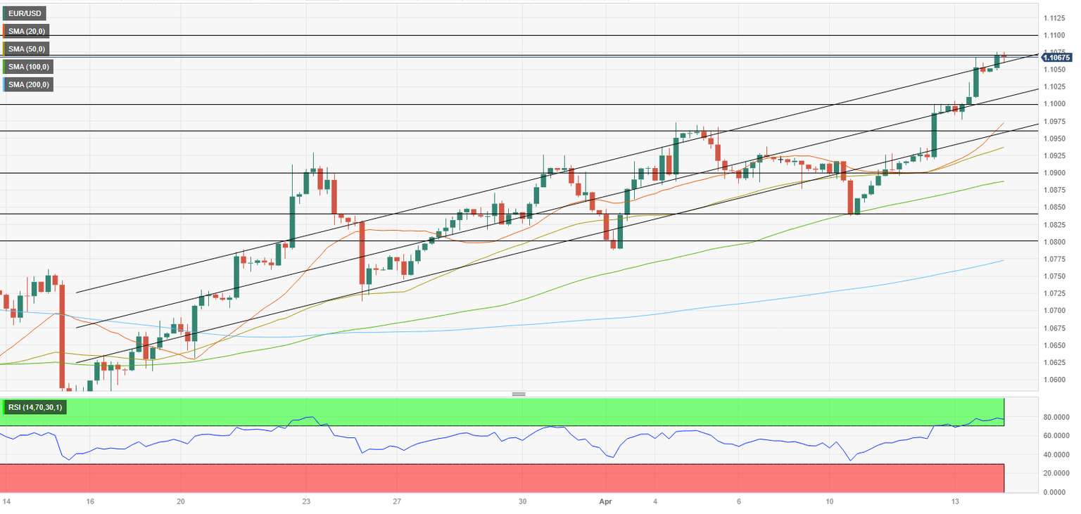 EUR/USD has gathered further bullish momentum and climbed to its highest level in over a year above 1.1070. The pair's near-term technical outlook shows overbought conditions as investors move to the sidelines ahead of the last data releases of the week from the US.