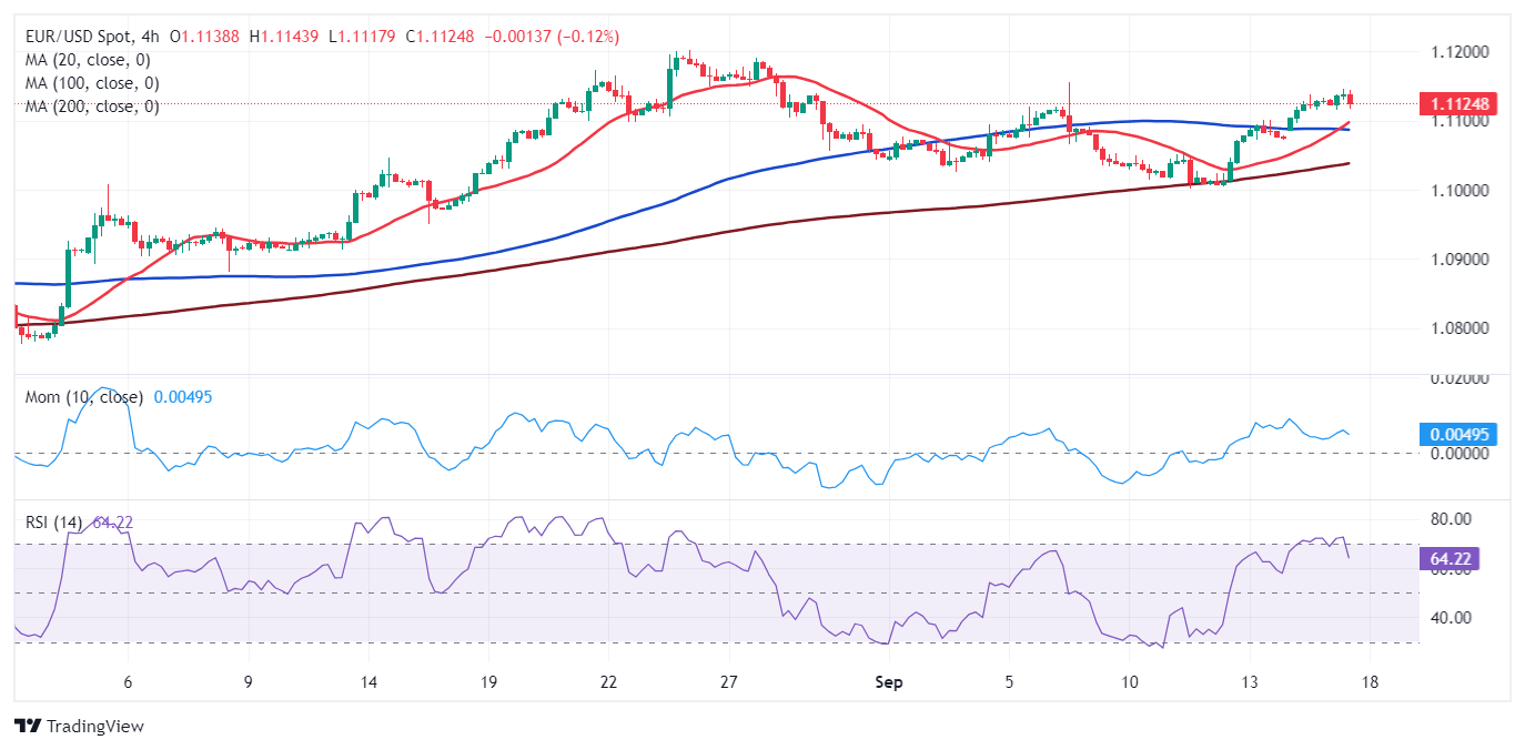 The EUR/USD pair maintains its positive tone on Tuesday, currently retreating from an intraday high of 1.1145, ahead of the United States (US) opening. Financial markets trade with a cautious stance as the US Federal Reserve’s (Fed) monetary policy decision looms. The Fed is expected to trim interest rates on Wednesday after pushing them towards record highs in the aftermath of the pandemic. As a result, the US Dollar remains pressured across the FX board.