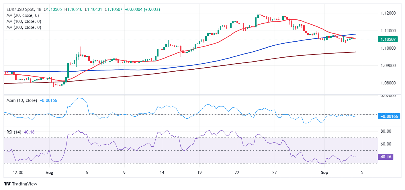 At the same time, the 4-hour chart offers neutral-to-bearish clues. The 20 SMA develops below the 100 SMA but has lost its downward slope. It still provides intraday resistance in the 1.1060 price zone. Finally, the Momentum indicator remains directionless around its 100 level, while the Relative Strength Index (RSI) indicator aims marginally lower ar around 39, skewing the risk to the downside.