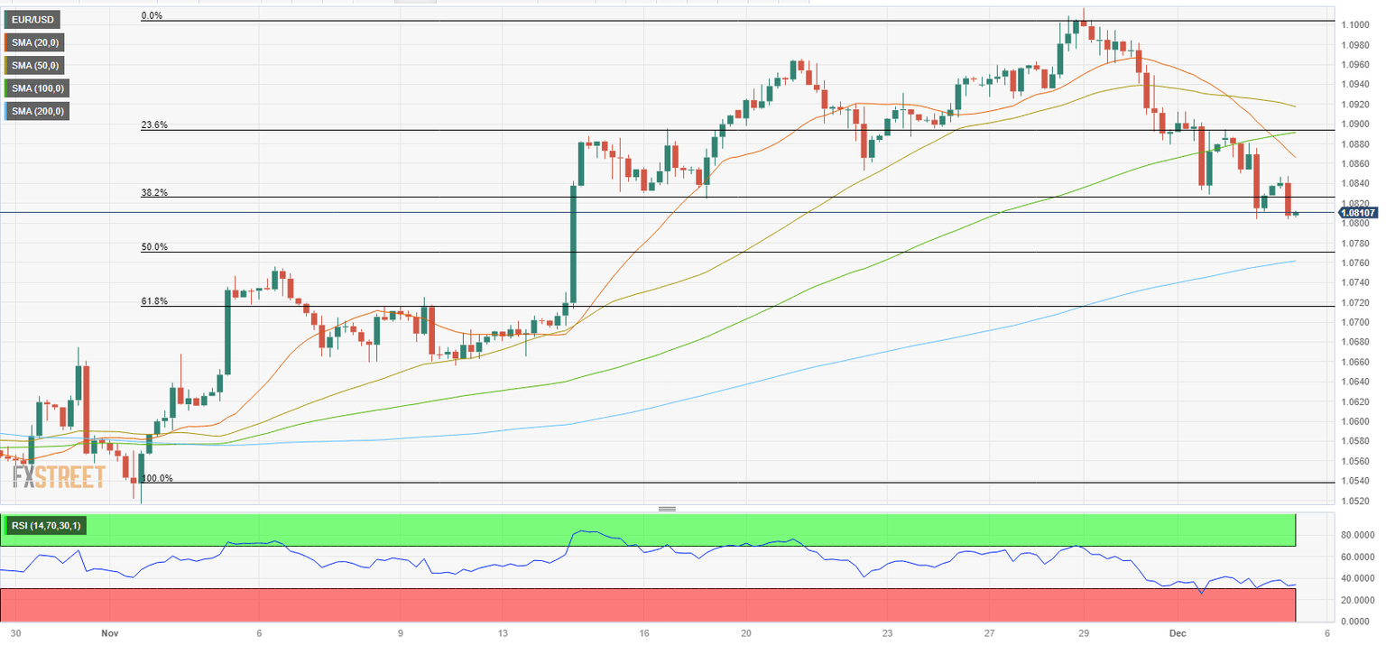 EUR/USD declined below 1.0820 early Tuesday, where the 200-day Simple Moving Average (SMA) and the Fibonacci 38.2% retracement of the latest uptrend are located. Below this level, 1.0800 (psychological level) aligns as interim support before 1.0760-1.0770 area (Fibonacci 50% retracement, 200-period SMA on the 4-hour chart).