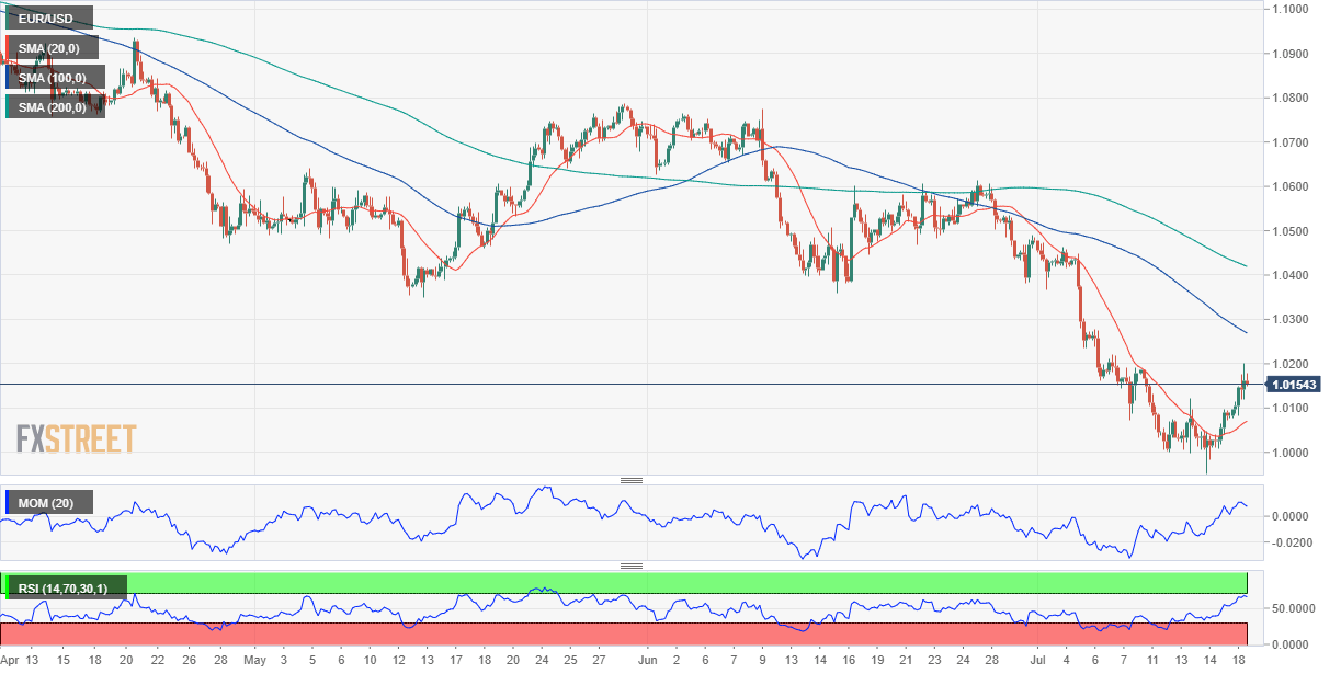 The EUR/USD pair holds on to substantial gains and trades in the 1.0160 price zone after hitting a daily high of 1.0200. The American dollar remained on the backfoot on Monday amid a better performance of stock markets. Investors remain concerned about looming recessions and overheated inflation, but at this point, it seems that policymakers would not do much more than what they have long ago anticipated.