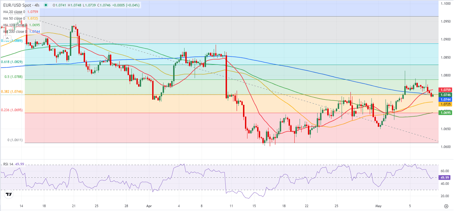 EUR/USD trades near 1.0750, where the Fibonacci 38.2% retracement level of the latest downtrend and the 200-period Simple Moving Average (SMA) on the 4-hour chart align. If the pair falls below that level and starts using it as resistance, 1.0725 (50-period SMA) could act as interim support before 1.0700 (Fibonacci 23.6% retracement, 100-period SMA) and 1.0650 (static level).