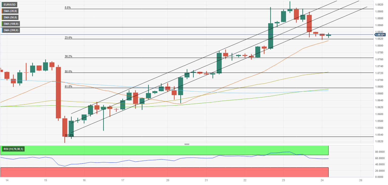On the downside, 1.0820 (Fibonacci 23.6% retracement of the latest uptrend, 20-period Simple Moving Average (SMA)) aligns as immediate support. In case the pair falls below that level and starts using it as resistance, the downward correction could extend toward 1.0760 (Fibonacci 38.2% retracement) and 1.0720 (50-period SMA).