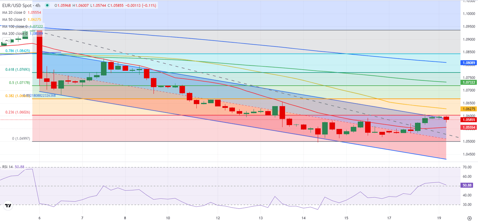 The upper limit of the descending regression channel and the Fibonacci 23.6% retracement of the two-week-old downtrend form important resistance at 1.0600. In case EUR/USD rises above this level and starts using it as support, the 20-period Simple Moving Average (SMA) on the 4-hour chart could act as interim resistance at 1.0630 ahead of 1.0670 (Fibonacci 38.2% retracement) and 1.0720 (Fibonacci 50% retracement).