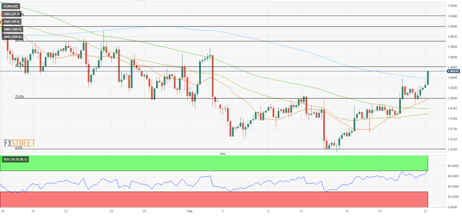 EUR/USD climbed above the 200-period Simple Moving Average (SMA) on the 4-hour chart for the first time since mid-January. In the meantime, the Relative Strength Index (RSI) indicator rose to 70, reflecting the bullish bias. If the pair stages a technical correction and 1.0840 (200-period SMA) holds as support, buyers are likely to remain interested.
