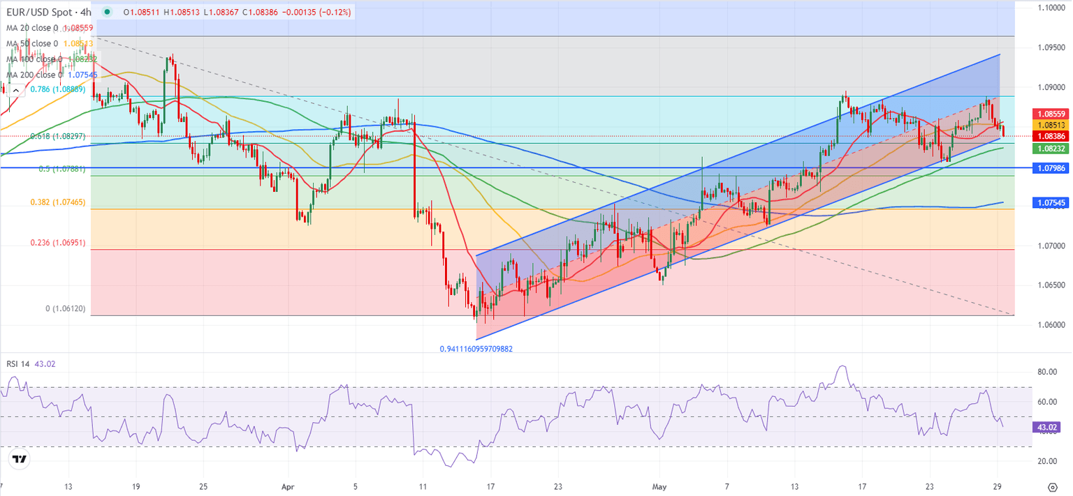 EUR/USD closes in on the lower limit of the ascending regression channel, which aligns as immediate support at 1.0830. If the pair drops below that level, the 100-day Simple Moving Average (SMA) could act as strong support at 1.0800 before 1.0780 (200-day SMA).