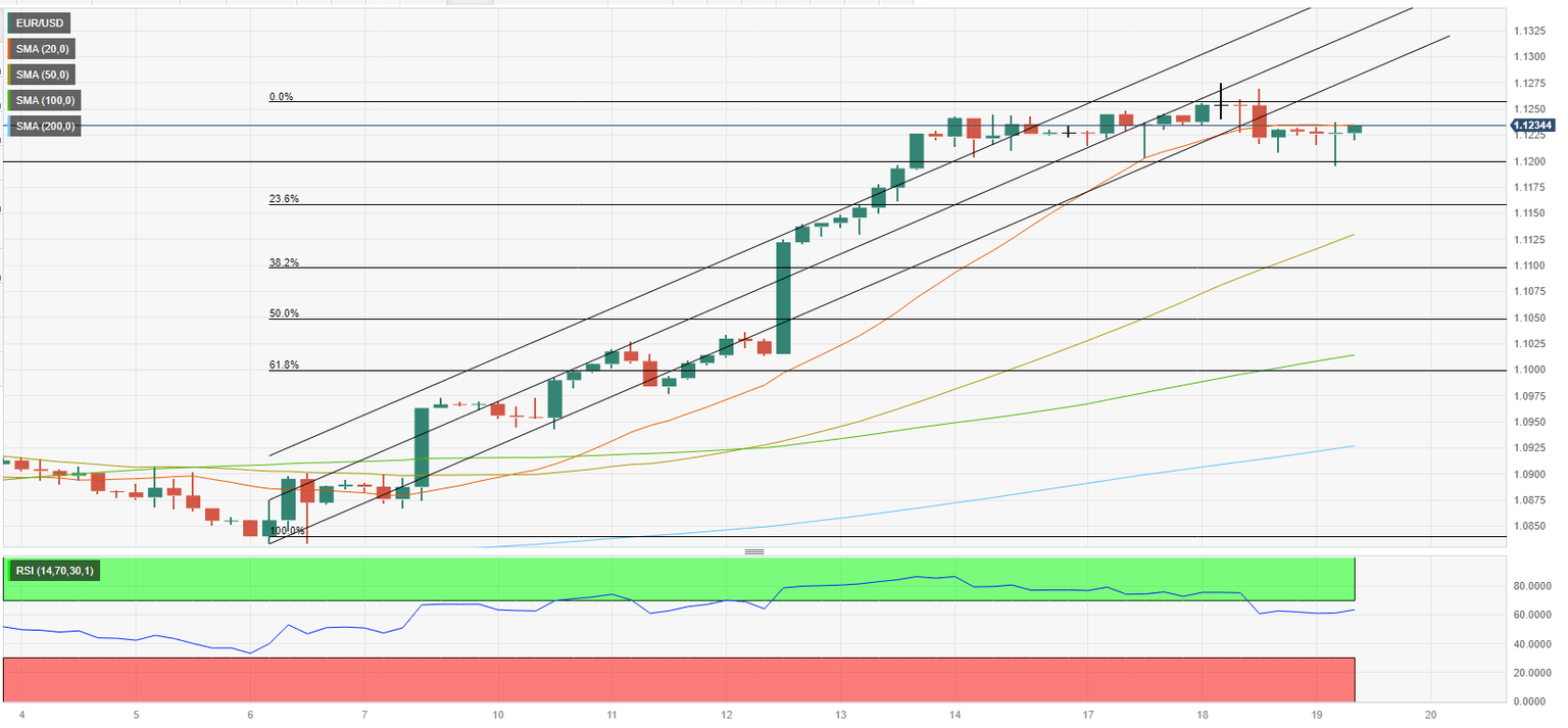 On the downside, 1.1200 (daily low, psychological level) aligns as first support ahead of 1.1160 (Fibonacci 23.6% retracement level of the latest uptrend) and 1.1130 (50-period SMA).