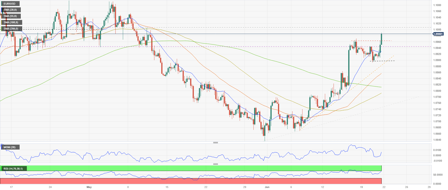 The EUR/USD pair resumed the upside, following three days of a bearish correction. It rose after finding support at the 55-day Simple Moving Average (SMA) and hit fresh monthly highs. The next area of relevance is 1.1000.