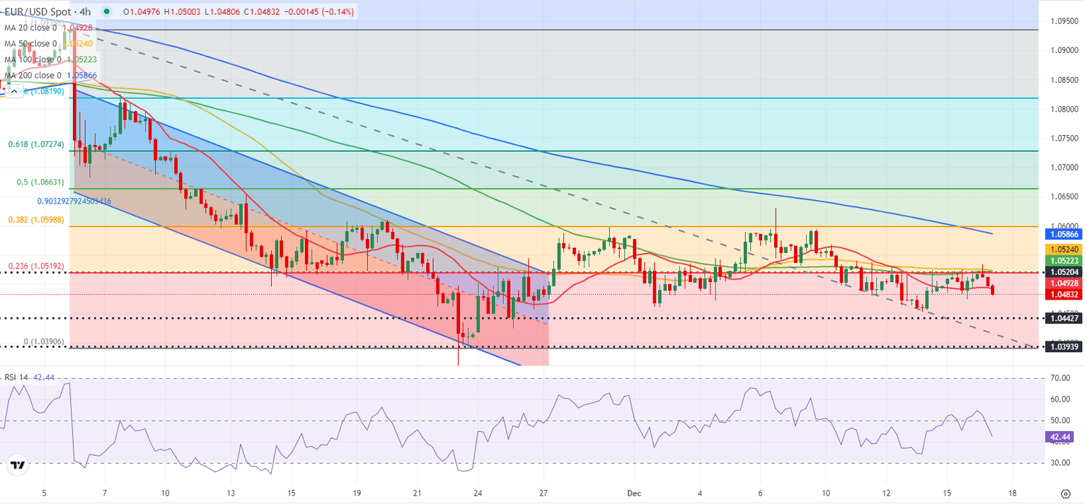 EUR/USD lost its traction after testing 1.0520, where the 100-period Simple Moving Average (SMA) on the 4-hour chart, the 50-period SMA and the Fibonacci 23.6% retracement of the latest downtrend align. Additionally, the Relative Strength Index (RSI) indicator dropped below 50, highlighting the lack of buyer interest.