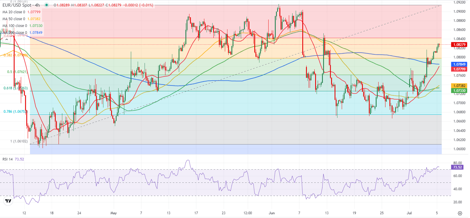 The Relative Strength Index (RSI) indicator on the 4-hour chart rose above 70 on Friday. Although this development suggests that EUR/USD is technically overbought, buyers could look to dominate the action as long as 1.0800 (100-day Simple Moving Average (SMA), 200-day SMA) stays intact as support. On the upside, 1.0840 (Fibonacci 23.6% retracement of the latest uptrend) could be seen as interim resistance before 1.0900 (psychological level, static level).