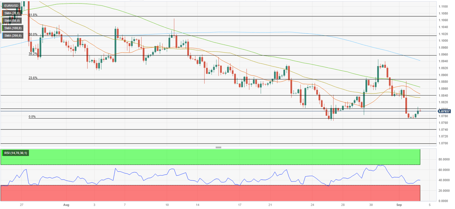 EUR/USD fell sharply on Friday and closed the seventh consecutive in the negative territory. Supported by the improving risk mood early Monday, the pair recovered to the 1.0800 area. With stock and bond markets in the US remaining closed in observance of the Labor Day holiday, however, EUR/USD could have a difficult time gathering directional momentum.