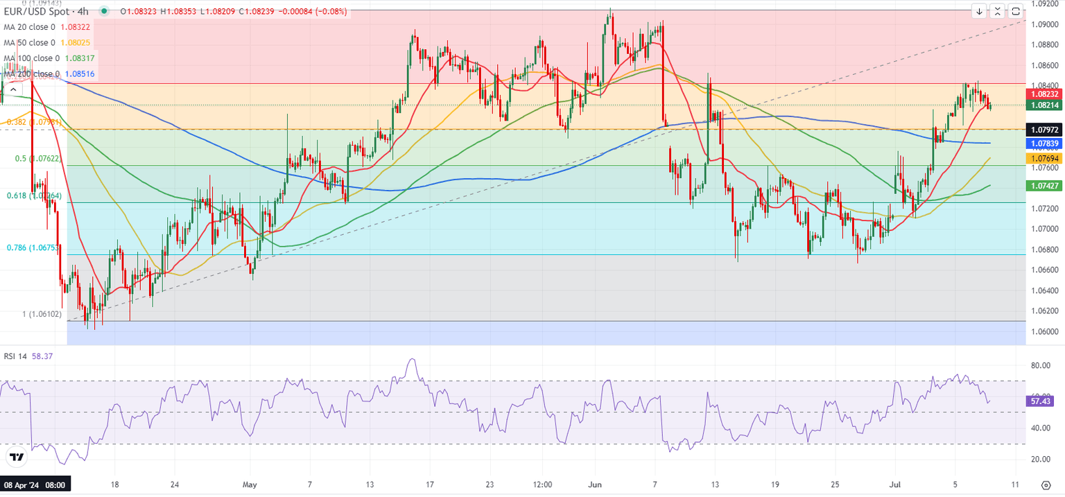 On the downside, the 100-day and the 200-day Simple Moving Averages form strong support at 1.0800. A daily close below this level could discourage the buyers and open the door for an extended correction toward 1.0760 (Fibonacci 50% retracement).