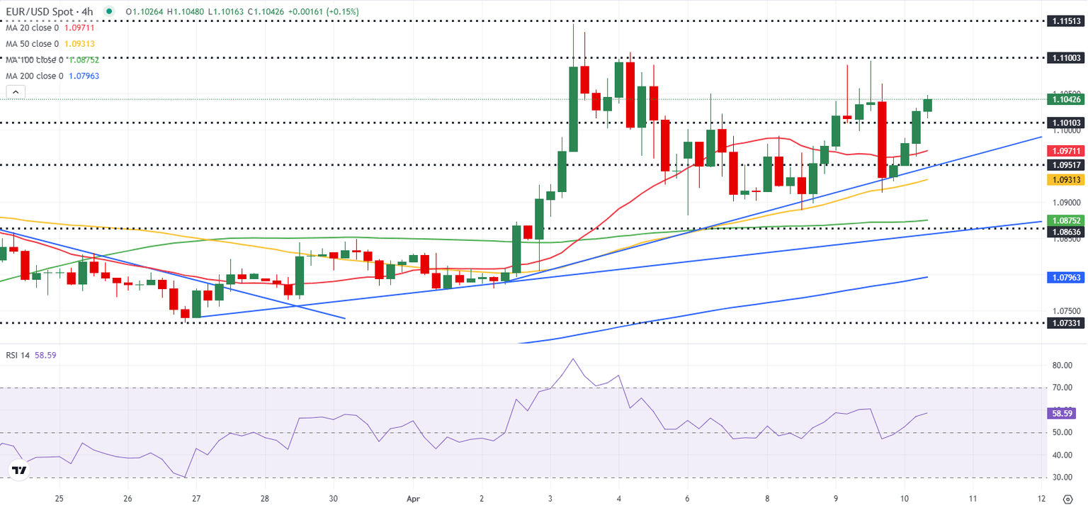 EUR/USD could face immediate resistance at 1.1050 (static level) before 1.1100 (static level) and 1.1145 (April 3 high). On the downside, 1.1000 (static level, round level) aligns as immediate support before 1.0950 (static level) and 1.0900 (static level, round level).