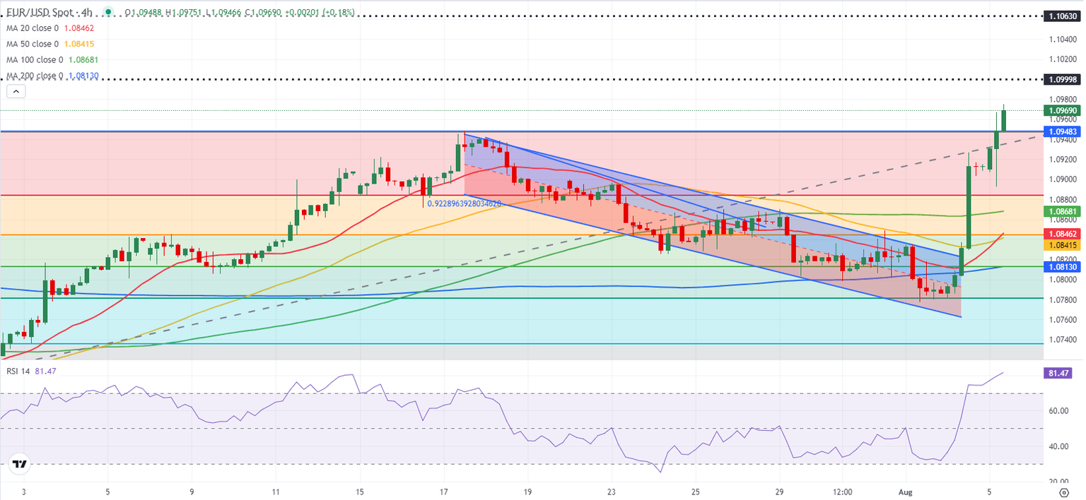 Disappointing labor market data from the US triggered an intense US Dollar (USD) selloff in the American session on Friday. Nonfarm Payrolls in the US rose 114,000 in July, missing the market expectation of 175,000 by a wide margin, and the Unemployment Rate climbed to 4.3% from 4.1% in June. Following the July jobs report, the CME FedWatch Tool shows that markets are nearly fully pricing in a 50 basis points Federal Reserve (Fed) rate cut in September.