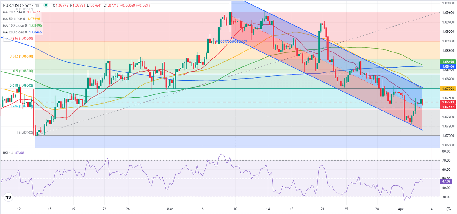 Strong resistance seems to have formed at 1.0800 (upper limit of the descending channel, Fibonacci 61.8% retracement) before 1.0830 (Fibonacci 50% retracement) and 1.0850 (100-period and 200-period Simple Moving Averages).