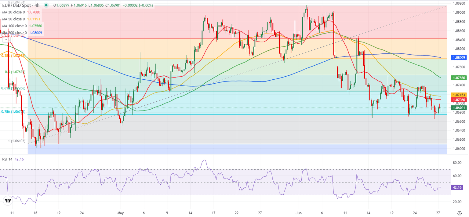 EUR/USD extended its slide and touched its weakest level since early May slightly below 1.0670 on Wednesday. Although the pair edged higher early Thursday, it lost its recovery momentum after meeting resistance near 1.0700.