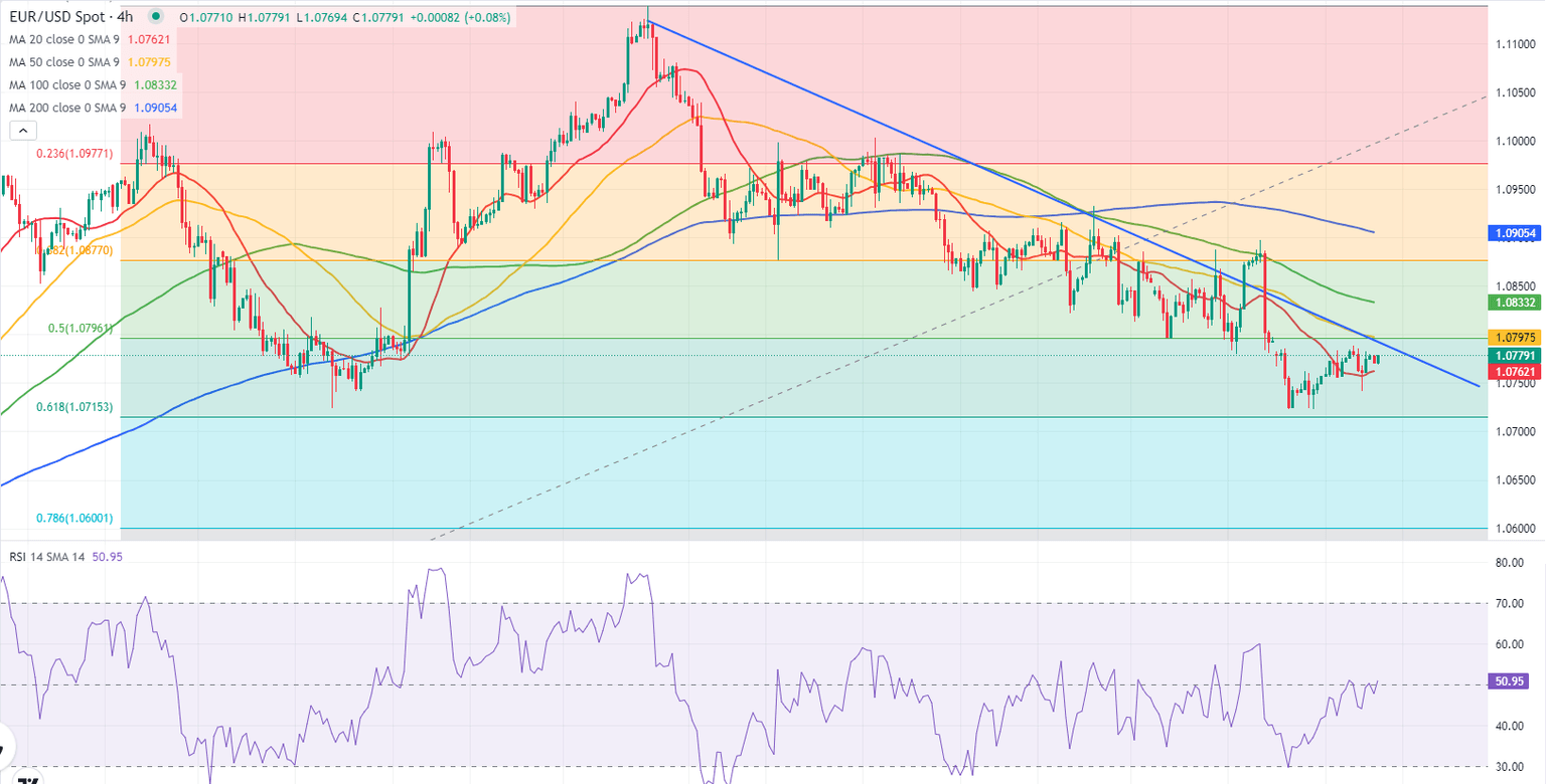 - EUR/USD fluctuates in a tight channel below 1.0800 on Friday.