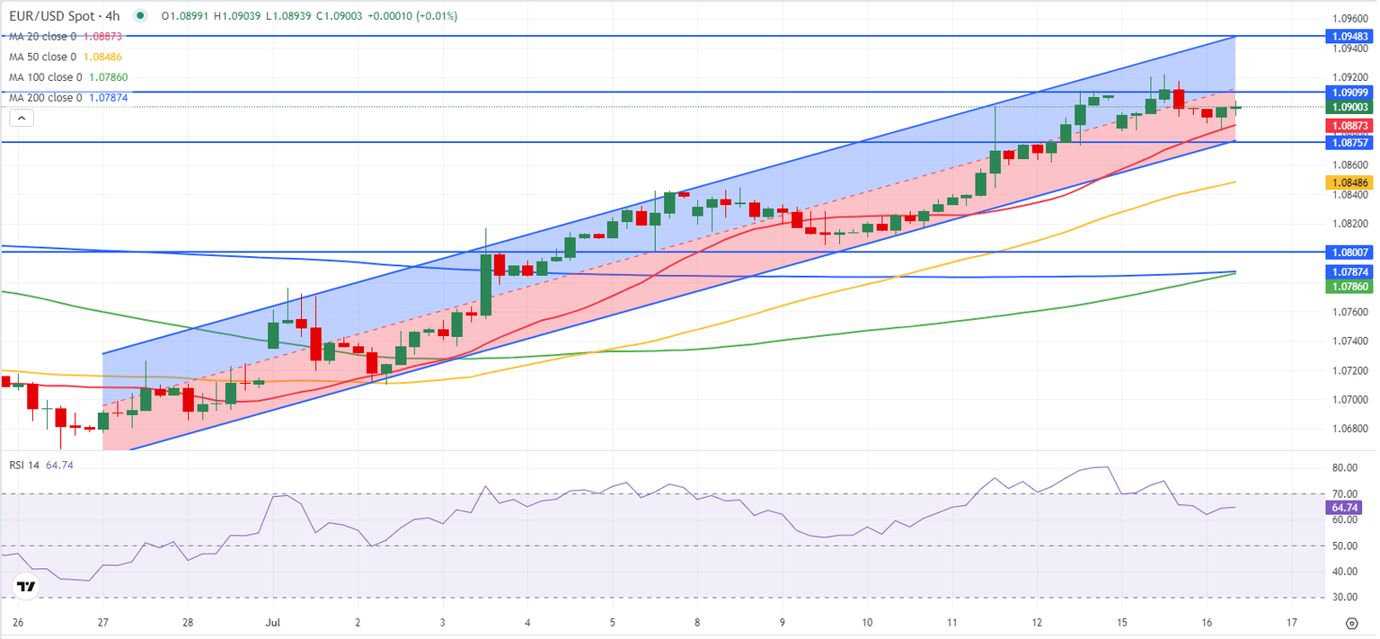 EUR/USD moves up and down in a tight band at around 1.0900 in the European trading hours on Tuesday after closing the first trading day of the week virtually unchanged. The pair's near term technical outlook suggests that the bullish bias remains intact.