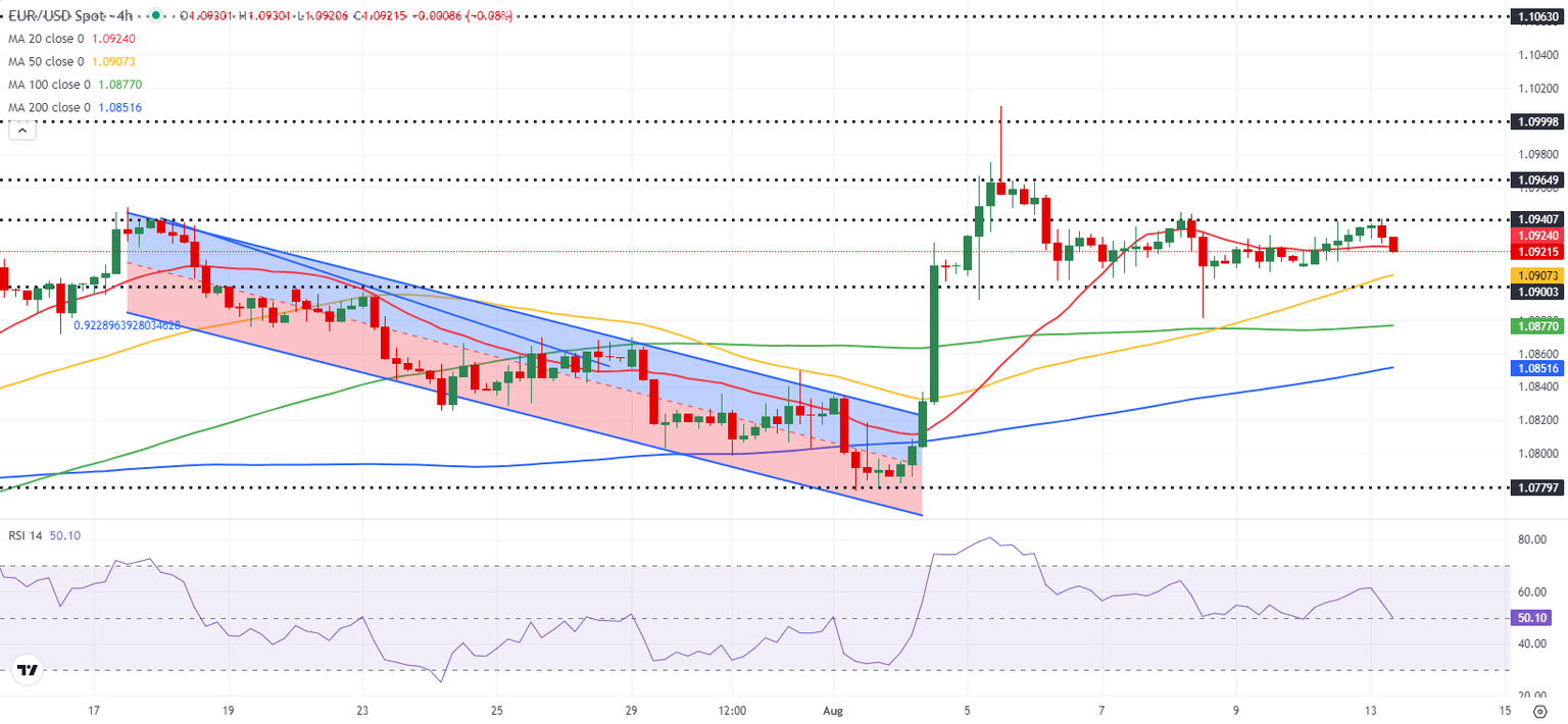 EUR/USD continues to trade in the one-week-old horizontal range between 1.0900 and 1.0940. Additionally, the Relative Strength Index (RSI) indicator on the 4-hour chart retreats toward 50 early Tuesday, reflecting a lack of directional momentum.