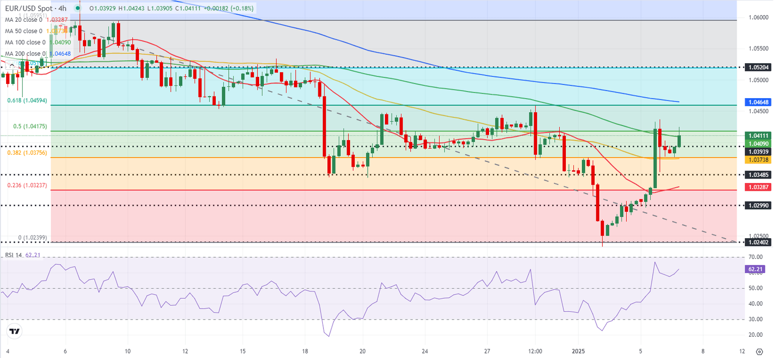 The Relative Strength Index (RSI) indicator on the 4-hour chart holds above 60, reflecting the bullish bias in the near term. The Fibonacci 50% retracement level of the latest downtrend and the 100-period Simple Moving Average (SMA) form a key resistance area at 1.0410-1.0420. In case EUR/USD rises above this area and starts using it as support, 1.0460 (200-period SMA; Fibonacci 61.8% retracement) could be seen as next resistance before 1.0520 (Fibonacci 78.6% retracement).