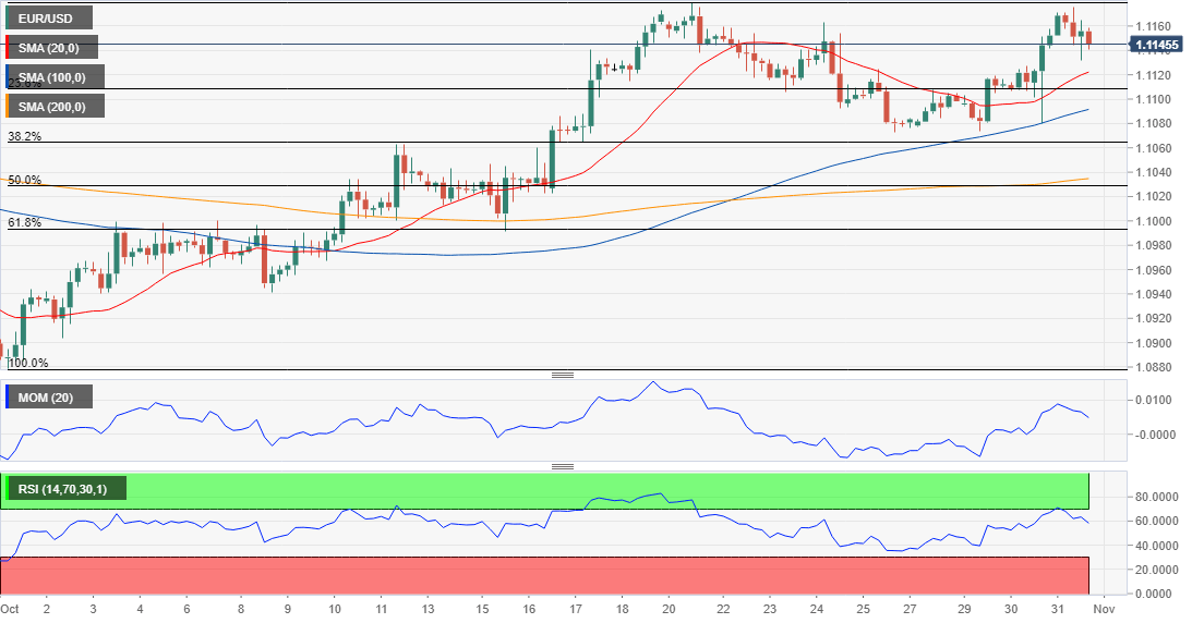 The EUR/USD pair was unable to advance beyond the October high at 1.1179 but ends the day, and the month quite close to it, which skews the risk to the upside. The short-term picture favours additional advances, as, in the 4-hour chart, the pair is above all of its moving averages, with the 20 SMA heading firmly north. Also, technical indicators have retreated from overbought levels, but have decelerated their declines, holding well into positive ground. The bullish potential will likely increase on a break above 1.1180, with room then to extend its advance toward the 1.1240/50 price zone.