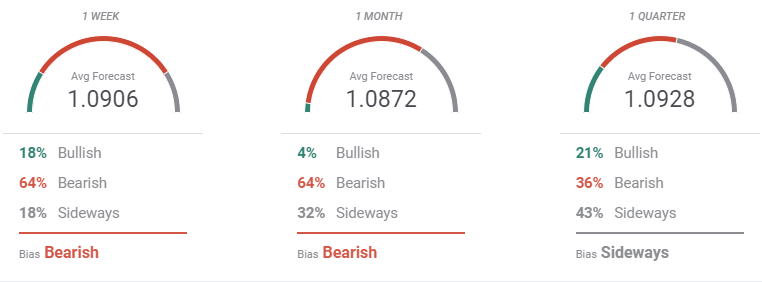 The FXStreet Forecast Poll is showing that speculative interest doesn’t believe the ongoing recovery could last long. Bears are a majority in the three time-frame under study, with over 60% of the polled experts willing to sell in the next few weeks. The quarterly perspective shows that most investors are sideways, with bears at 36% and bulls just at 21%. On average, the pair is seen around the 1.0900 level.