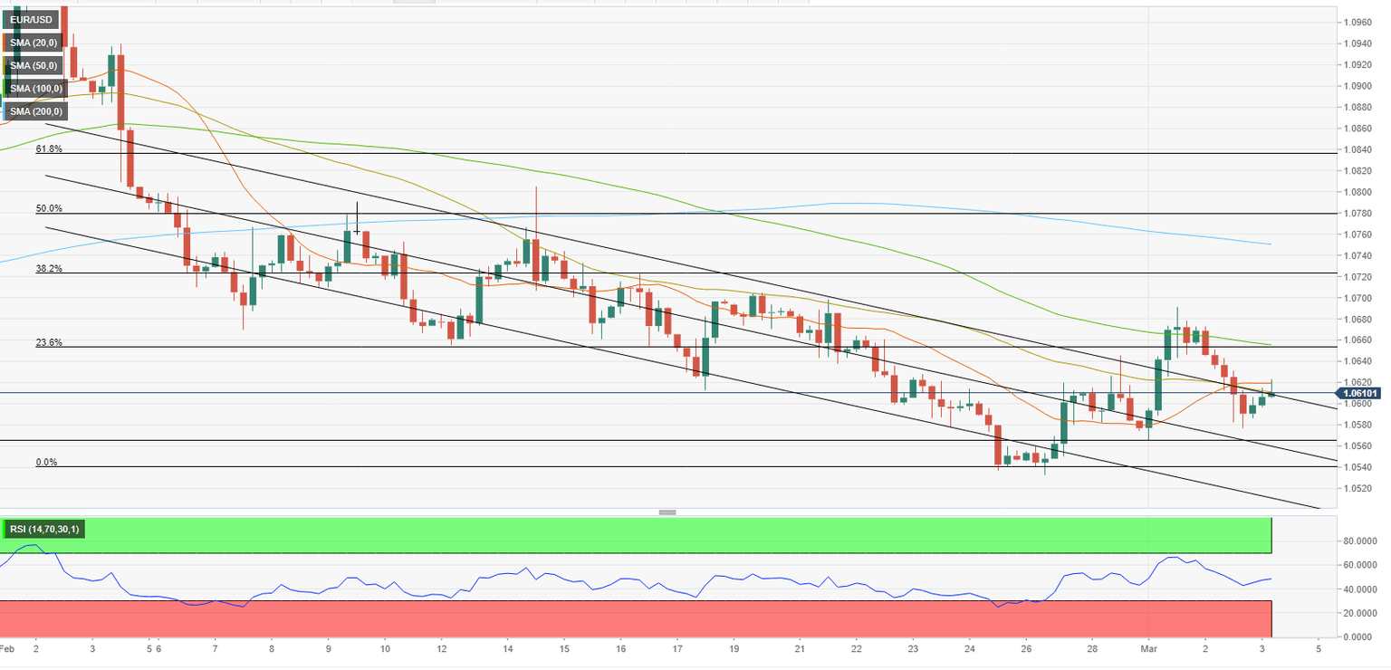 EUR/USD is currently trading slightly above the descending regression channel coming from early February. The 20-period and the 50-period Simple Moving Averages (SMA) reinforce that resistance area that aligns at 1.0610/1.0620. Once the pair stabilizes above that hurdle, it could target 1.0650/60 (Fibonacci 23.6% retracement of the latest downtrend, 100-period SMA), 1.0700 (psychological level) and 1.0720 (Fibonacci 38.2% retracement).