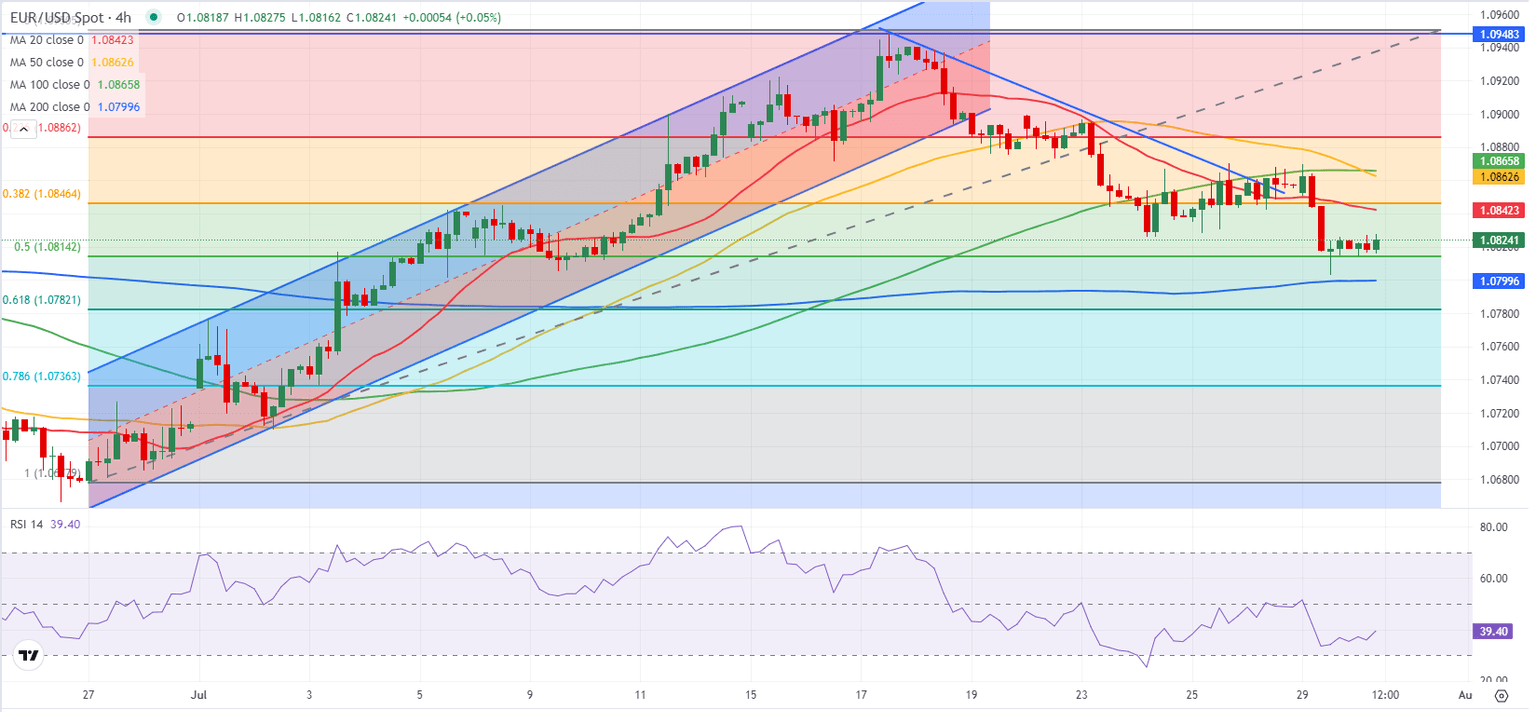 EUR/USD holds above the 1.0800-1.0810 support area, where the 100-day and the 200-day SMAs are located. If this support fails, 1.0740 (Fibonacci 78.6% retracement of the latest uptrend) could be seen as next bearish target before 1.0700 (psychological level, static level).