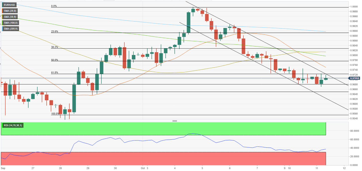 Despite the latest rebound, EUR/USD trades within the descending channel coming from October 4 and the Relative Strength Index (RSI) indicator on the four-hour chart stays below 50, suggesting that the bearish bias stays intact. If the pair rises above 0.9720 (Fibonacci 61.8% retracement of the latest uptrend, upper-limit of the descending channel) and starts using that level as support, it could extend its recovery toward 0.9750 (20-period SMA) and 0.9780 (Fibonacci 50% retracement).